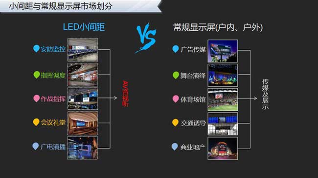 目前,小间距LED产品在“AV音视听”市场实现“超常规成长”,并持续挤压DLP拼接、LCD拼接市场。如高端指挥调度中心大屏应用的增量市场,已经7成以上属于小间距LED产品。